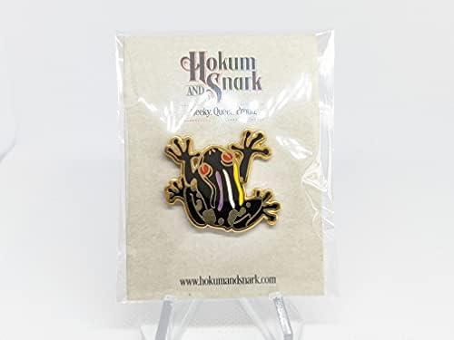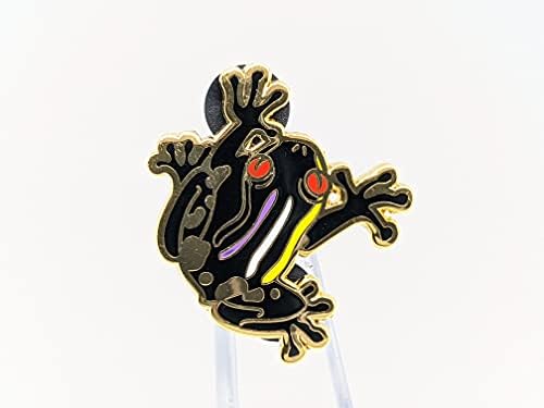 Stealthy tree frog! This 1.5 by 1.25” hard enamel pin is hard-fired and coated so the colors won’t chip or fade. It has 2 7mm post and rubber clutches that grip better than metal pinch clasps. Custom designed by two queer creators and manufactured to our specs. This gem will look great on your hat, backpack, bag, lanyard, collar, jacket, tie, vest, or anywhere you want to display your pride.