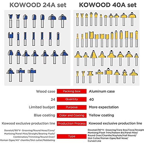 Juego de brocas para rebajadora KOWOOD de 40 piezas, vástago de 1/4 de pulgada, kit de brocas de fresadora Expert