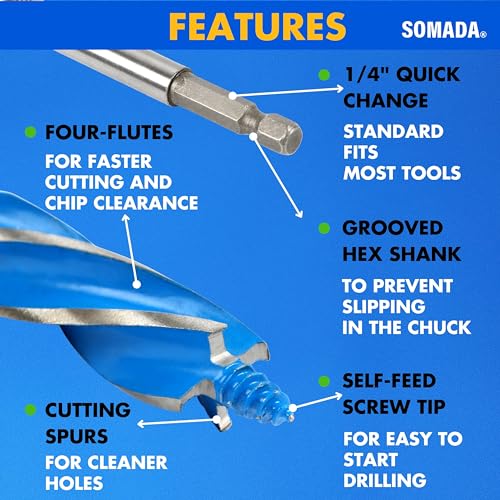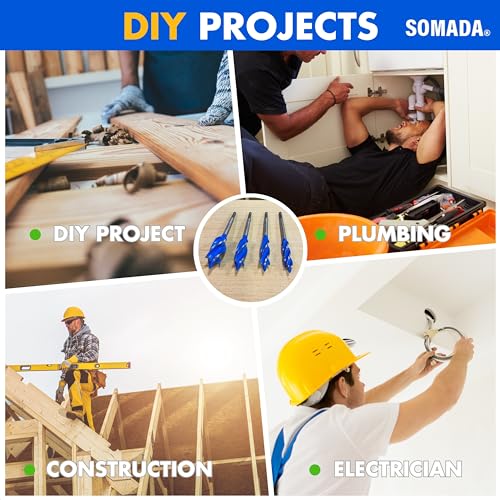 - 🏆Advantages of SOMADA Auger Bits: Opting for a SOMADA auger bit set ensures the ability to bore deep and seamless holes in wood, plastic, and various other materials. The screw tip facilitates a safer and smoother initiation compared to spade or paddle bits.
