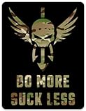 Durable Vinyl Construction: This tactical sticker is made from high-quality vinyl with a scratch-resistant laminate for long-lasting durability. Water and Fade Resistant: The sticker's material is designed to withstand exposure to water and resist fading over time. Peel and Stick Backing: Featuring a convenient peel and stick adhesive backing for easy application on various surfaces. Motivational Design: The bold 'Do More Suck Less' text and winged skull logo create a motivational and tactical aesthetic. Compact Size: Measuring 3 inches wide and 4 inches tall, this sticker is a perfect size for adding a touch of style to various surfaces.