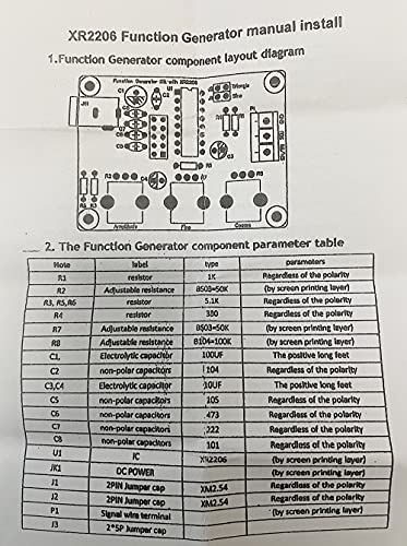 Specifications: Voltage Supply: 9-12V DC Input Waveforms: Square, Sine & Triangle Impedance: 600 Ohm + 10% Frequency: 1Hz-1MHz SINE WAVE Amplitude: 0-3V at 9V DC Input Distortion: Less than 1% (at 1KHz) Flatness: +0.05dB 1Hz - 100kHz SQUARE WAVE Amplitude: 8V (no load) at 9V DC Input Rise Time: Less than 50ns (at 1KHz) Fall Time: Less than 30ns (at 1KHz) Symmetry: Less than 5% (at 1KHz) TRIANGLE WAVE Amplitude: 0-3V at 9V DC Input Linearity: Less than 1% (up to 100KHz) 10mA The welding installation considerations, follow these steps: 1. The components are welding the front board, from low to high principles, namely the first low welding components, such as, capacitor, resistor, diode, etc. 2.Welding IC socket, terminal blocks, finally power socket, adjustable potentiometer. 3.The back with a diagonal cutting pliers to cut short the pins as far as possible. Debugging steps: 1.After completion of welding on IC, XR2206, pay attention to the direction of IC, insert the might damage the chip! 2. check the IC whether against, such as anti please timely correction. 3. Insert the power supply, power supply for 5.5 * 2.1 port, inside outside is negative polarity. For 9-12 v power supply voltage. The waveform may not be stable for more than 12V. Using the step: 1. J1 jumper cap plug in, SIN/TRI blue terminals output sine wave (note J1, J2 can only insert one of) 2. J2 jumper cap plug in, SIN/TRI blue terminals output triangular wave (note J1, J2 can only insert one of) 3. SQU blue terminals output pulse 4. AMP : Sine wave, triangle wave amplitude adjustment 5. FINE : Frequency fine adjustment 6. Coarse : Frequency of coarse adjustment Package include: 2 X Signal Generator Kit, XR2206 Precise Function Signal Generator Frequency Module
