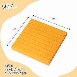 - Specifications: Quantity: 4 Pads/Pack, 90 sheets/pad Size: 3 x 3 inch 4 Bright Colors: Oringe. Material: Paper. Package Include: 4 X Lined Sticky Notes.