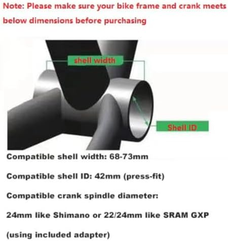- Compatible with bottom bracket shells that are 68–73mm wide and have a 42mm inner diameter (press-fit type). Designed for cranksets with 24mm spindles (Shimano standard) or 22/24mm stepped spindles (SRAM GXP standard). *Note: This bottom bracket does NOT work with traditional 30mm spindles commonly found in original BB30 setups. Be sure to check your bike frame’s bottom bracket shell and crank spindle size before purchasing.