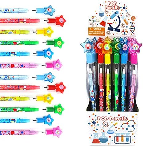 TINYMILLS 24 Pcs Science Themed Multi Point Stackable Push Pencil Assortment with Eraser for Science Birthday Party Favor Prize Goodie Bag Stuffers Classroom Rewards