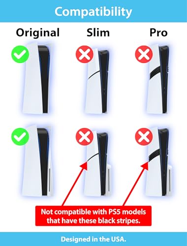 - NO COMPATIBLE CON PS5 “SLIM” O PS5 “PRO” – Este sistema de montaje está diseñado para MODELOS ORIGINALES DE PS5 (incluyendo la consola con disco y la edición digital). Este montaje no es compatible con los modelos PS5 SLIM y PS5 PRO, que tienen una franja negra horizontal.