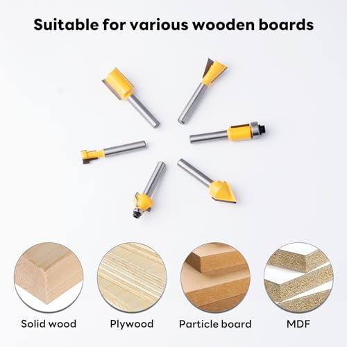 - WIDELY FUNCTION: This router bit set is suitable for many wooden boards, such as hardwood, softwood, solid wood, plywood, particleboard, MDF, etc. Perfect for professional carpenters and hobbyists trimming, grooving, punching, carving, edging and veining in all woodworking projects