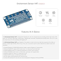 Standard Raspberry Pi 40PIN GPIO extension header, supports Raspberry Pi series boards. Onboard TSL25911FN digital ambient light sensor, for measuring IR and visible light Onboard BME280 sensor, for measuring temperature, humidity, and air pressure Onboard ICM20948 motion sensor, accelerometer, gyroscope, and magnetometer. Onboard LTR390-UV-1 sensor, for measuring UV rays Onboard SGP40 sensor, for detecting ambient VOC. I2C bus, allows retrieving data by just using two wires Comes with development resources and manual (examples for Raspberry Pi/Arduino/STM32)