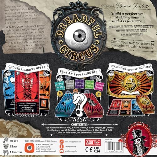 Dreadful Circus is a set collection card game by Bruno Faidutti (Citadels, Diamant) taking us to a creepy and mysterious world. While trying to create the most successful circus in town, your job is to organize unforgettable attractions and spectacular performers to attract the best contracts and make the most money. The wonderful, dark graphic artwork is just a hint of what is awaiting you in the game—fierce competition based on bidding, negotiations, and unique player interaction!