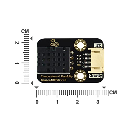 DFRobot Gravity: I2C Temperature and Humidity Sensor-DHT20 Features Factory calibration I2C digital output Quick response, strong anti-interference ability Low power, low cost Compatible with mainboards like Arduino, micro:bit, ESP32, Raspberry Pi Compatible with 3.3~5.5V main controller Specification Operating Voltage: 3.3V ~ 5.5V DC Operating Current: <1mA Output Signal: I2C (0×38) Temperature Range: -40 ~ +80°C ±0.5°C Humidity Range: 0~100%RH ±3%RH (25°C) Resolution: 0.01℃, 0.024%RH Storage Condition: 10℃-50℃, 20-60%RH Board Dimension: 22*33 mm/0.87*1.30” Mounting Hole Size: Inner diameter 3.1mm (0.13”)/Outer diameter 6 mm (0.24”) Shipping List Temperature and Humidity Sensor × 1 Gravity-4Pin I2C Sensor Connector 30cm × 1