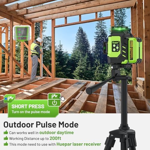- 【Outdoor Pulse Mode Function】This laser level projects green laser beam which is 4 times brighter than standard red beams with a working range up to 30m/98Ft of an accuracy +/- 3mm/10m/(+/- 1/9" at 33Ft). In an environment with strong outdoor light, the clarity of the laser line may be reduced. So if you need to work outside in bright light or at a longer distance. You can turn on the pulse mode function and use simultaneously with the Huepar laser receiver to detect laser lines. The outdoor pulse mode can extend this 3D laser level's working distance up to 60m/197Ft and use in outdoor daytime