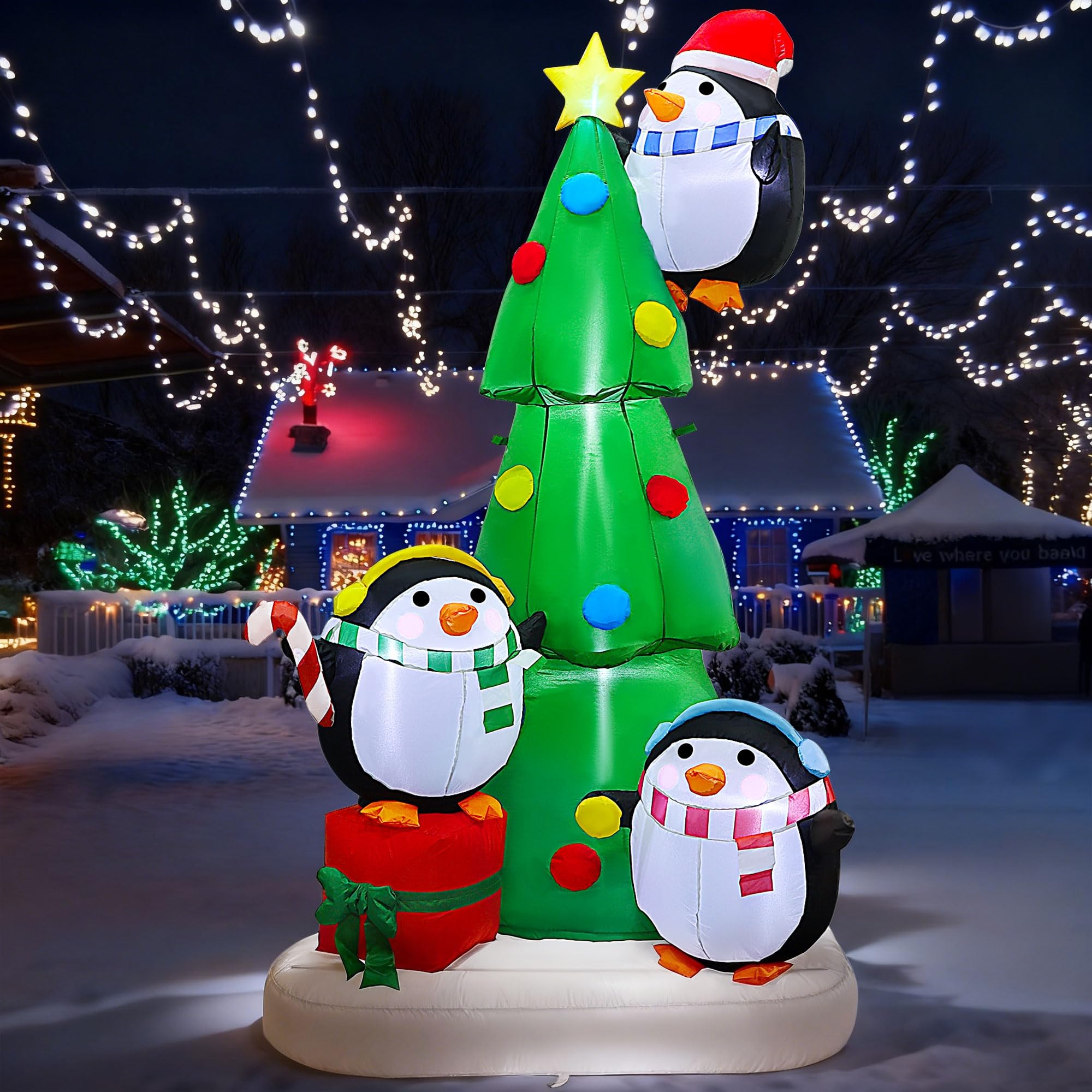 - INFLATBLE XMAS TREE: Three-layered Christmas tree wears a bright yellow star topper with its body adorned with colorful balls and gift boxes in blue red and green distributed around. When plugged in, the entire tree glows a festive atmosphere and the dynamic lighting inside is great charming, which would definitely impress people greatly and get thousands of compliment!