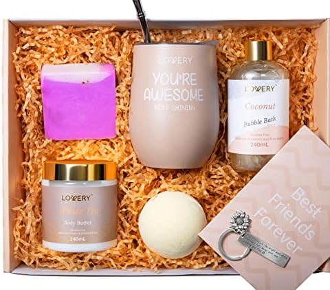 - ALL OCCASION GIFT: This Gift Box comes with 12oz Insulated Stainless Steel Tumbler with the words "You’re Awesome, Keep Shining" permanently laser engraved, Stainless Steel Straw and Spoon, 150g Lavender Handmade Soap, 240ml White Tea Body Butter, 240ml Coconut Bubble Bath, 150g Cherry Blossom Bath Bomb, Stainless Steel Car Keychain with a Friendship Quote and a Personalized “Best Friends Forever” Greeting Card for you to write that Heartfelt Message.