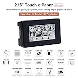 Provide online user manual (examples for Raspberry Pi Raspberry Pi Zero /Zero W) Partial Refresh Support, Low Power, Wide Viewing Angle, Paper-Like Effect 2.13" capacitive touch e-Paper display, 5-point touch, 250×122 pixels. Supports waken up by user-defined gesture No backlight, keeps displaying last content for a long time even when power down. Ultra low power consumption, basically power is only required for refreshing Standard Raspberry Pi 40PIN GPIO extension header, supports Raspberry Pi Zero / Zero W