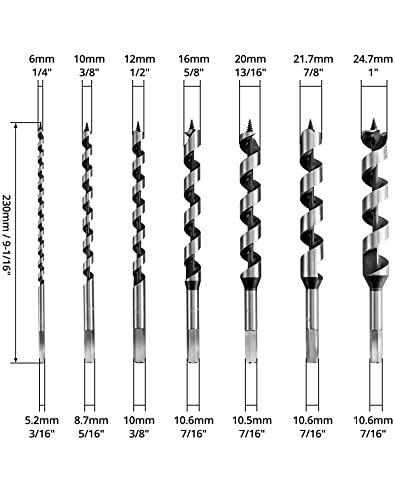 - Package includes: 7 Pcs Auger Bits. 6mm 10mm 12mm 16mm 20mm 22mm 25mm.