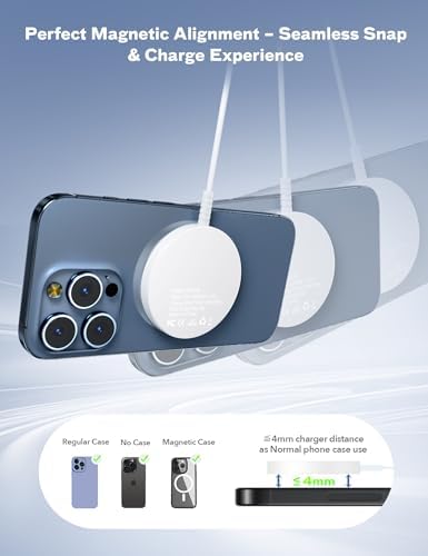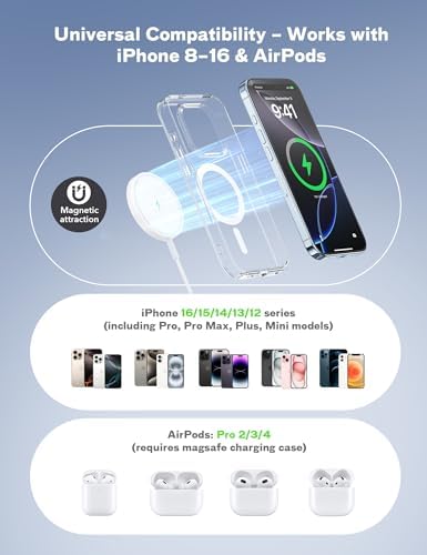 - 【Especialmente Diseñado para iPhone 16 15 14 13 12 Serie】Como aficionados que tienen el nuevo modelo de iPhone, no puedes perderte la experiencia de carga fresca y cómoda a través de la carga inalámbrica. El cargador magnético para iPhone es compatible con iPhone 16 15 14 13 12 serie, iPhone 16 15 14 13 12Pro serie, iPhone 16 15 14 Plus serie, iPhone 16 15 14 13 12 Pro Max serie, iPhone 13 12 Mini serie Airpods 4 3 2 pro con estuche de carga inalámbrica