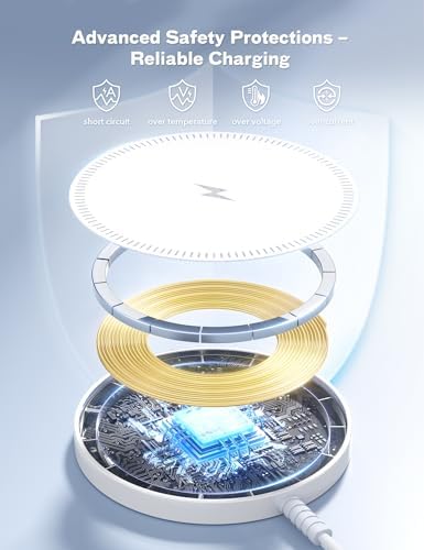 - 【Protección Inteligente Múltiple para Mantener la Seguridad】El cargador magnético inalámbrico para teléfono tiene un chip de gestión de carga incorporado, con funciones de protección inteligente múltiple contra sobrecorriente, sobrevoltaje, sobretemperatura, cortocircuitos, objetos extraños, etc. que pueden proteger tu dispositivo del daño por sobrecarga. Nota: Cuando la temperatura de carga del teléfono sea demasiado alta, el cargador inalámbrico para iPhone cortará automáticamente la carga y reanudará la carga después de enfriarse)