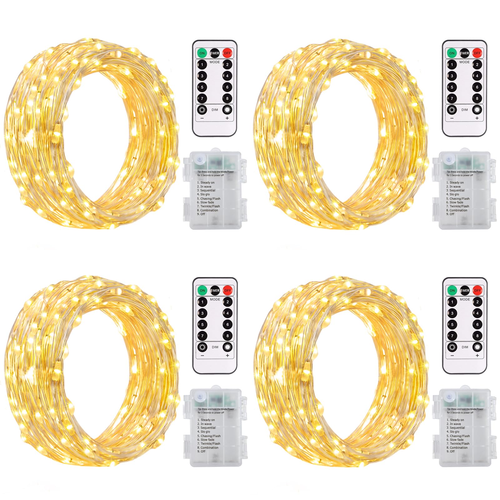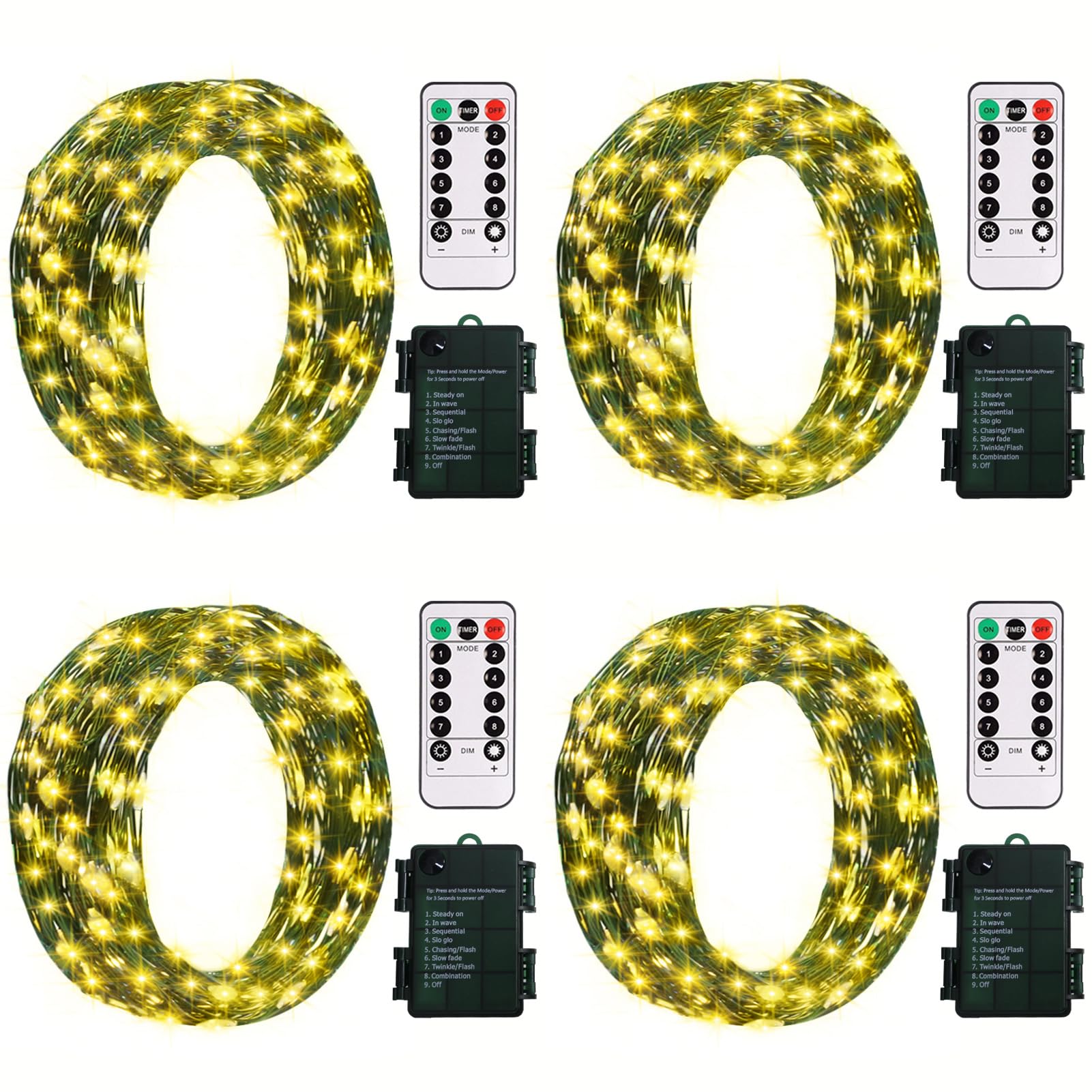 ZAIYW Battery Operated String Lights 4 Pack 16.5Ft 50LED String Lights with Remote Control 8 Modes Timer Christmas Lights Green Wire for Outdoor Garden Party Garlands Xmas Tree Decor (Warm White)