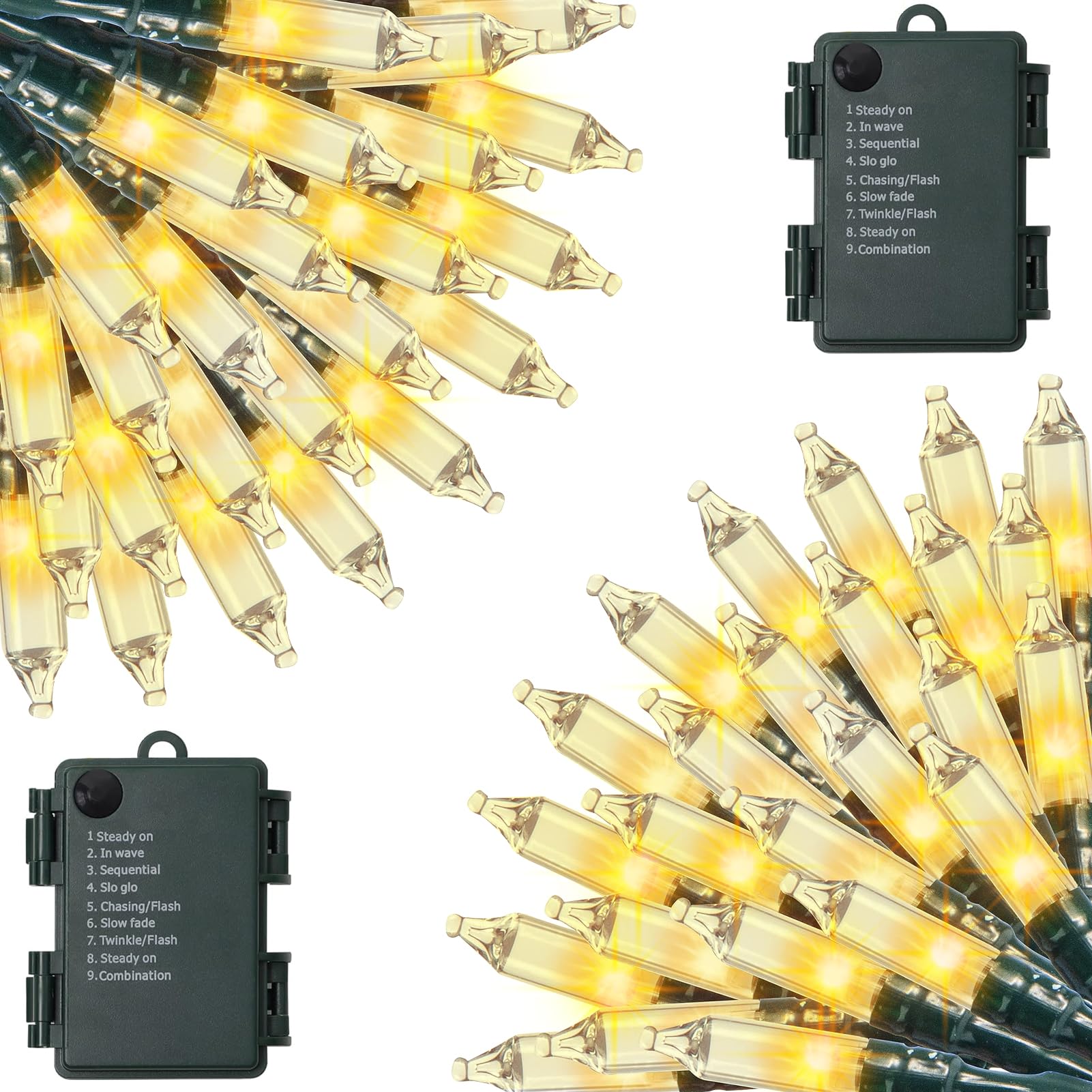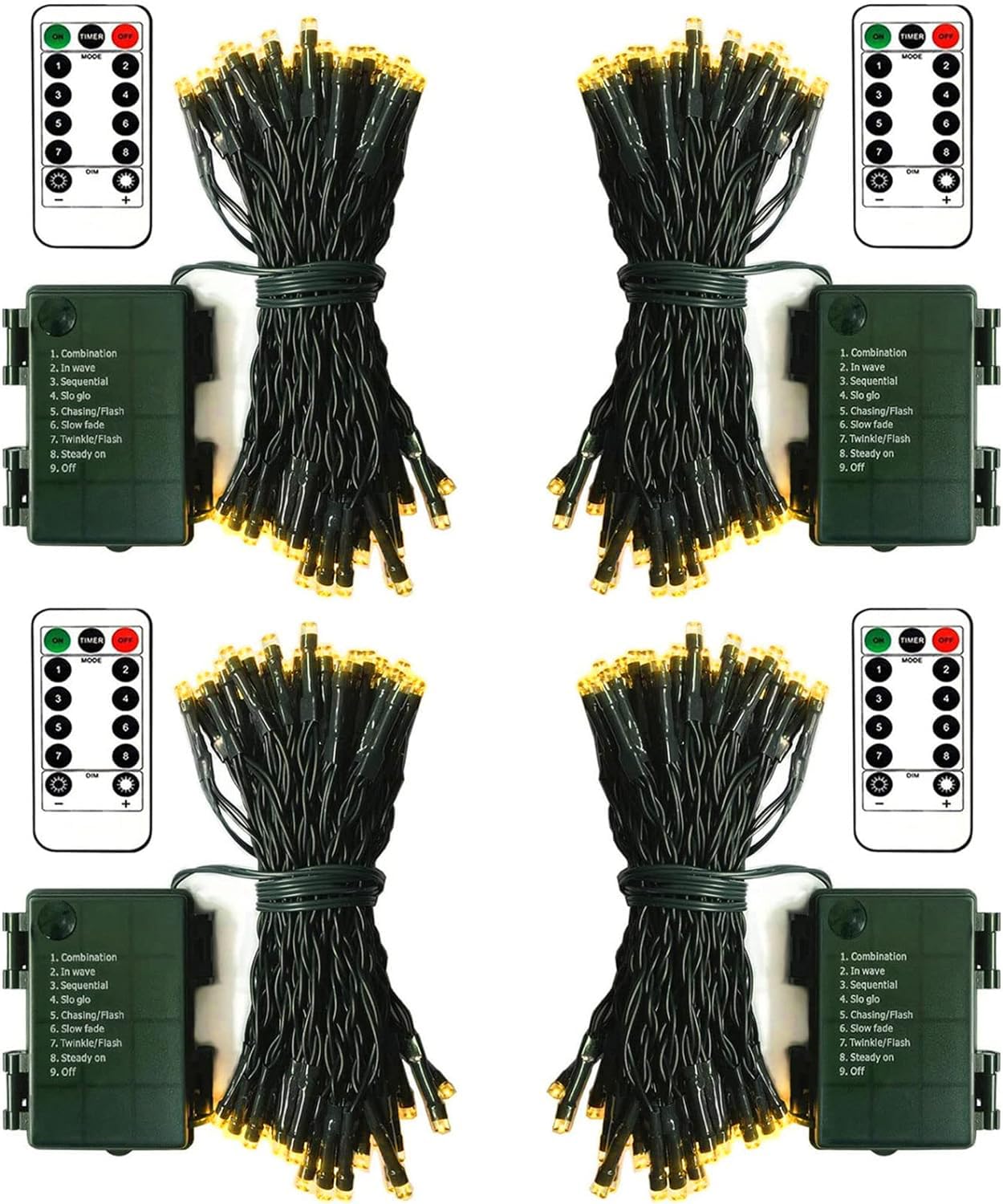 - Remote Control: ①: Timer (6 hours on, 18 hours off) ②: Brightness adjustments ③: 8 Lighting modes: Combination, In wave, Sequential, Slo Glo, Chasing/Flash, Slow fade, Twinkle/Flash, Steady on