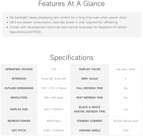 Waveshare 7.5inch E-Paper E-Ink Raw Display Compatible with Raspberry Pi 4B/3B+/3B/2B/B+/A+/Zero/Zero W/WH/Zero 2W Series Boards 800×480 Pixels Three-Color with SPI Interface Without PCB