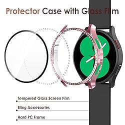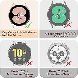 1.Specially Designed: Compatible with Samsung Galaxy Watch 4 44mm ONLY (2021 Model) Check Your Size Before Ordering [❌ DON'T compatible with Galaxy Watch Active 40mm/Watch Active2 40mm 44mm/ Watch 4 40mm/Watch 5 40mm 44mm 45mm/Watch 6 40mm 43mm 44mm 47mm/Watch 7 40mm and 44mm/Watch 8 40mm and 44mm46mm] 2.2 in 1 BLING Crystal Case & GLASS Screen Protector --- Hard slim case keeps your watch 4 44mm lightweight and easy to install. The jewelry bling rhinestone adding a brilliant array of sparkles. Built-In screen protector resists the hardest scratches and impact, feel smoother, more fluent operation, and will never hurt your fingers.( Charger without take off the case) 3.5-PACK for Your Choice --- Come with 5-Pack case compatible with Galaxy Watch4 44mm, Black, Rose gold, Silver,Clear, Rose Pink, different watch case to match the different color watch bands. 4.Perfect Fit And Excellent Protection --- The screen, power button, digital crown and the speaker can fit without having to remove the case, while still having total functionality of the buttons. Every button and hole opening was thought out carefully. 5.2 year customer service - if there is any quality problems, friendly customer service to make our customer satisfied.