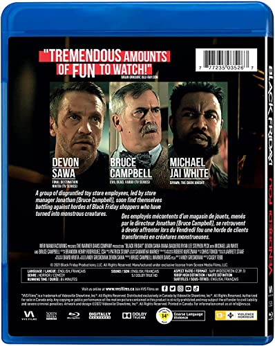 BLACK FRIDAY - On Thanksgiving night, a group of disgruntled toy store employees begrudgingly arrive for work to open the store at midnight for the busiest shopping day of the year. Meanwhile, an alien parasite crashes to Earth in a meteor. This group of misfits led by store manager Jonathan (Bruce Campbell) and longtime employee Ken (Devon Sawa) soon find them themselves battling against hordes of holiday shoppers who have been turned into monstrous creatures hellbent on a murderous rampage on Black Friday. Runtime:- 80 minutes