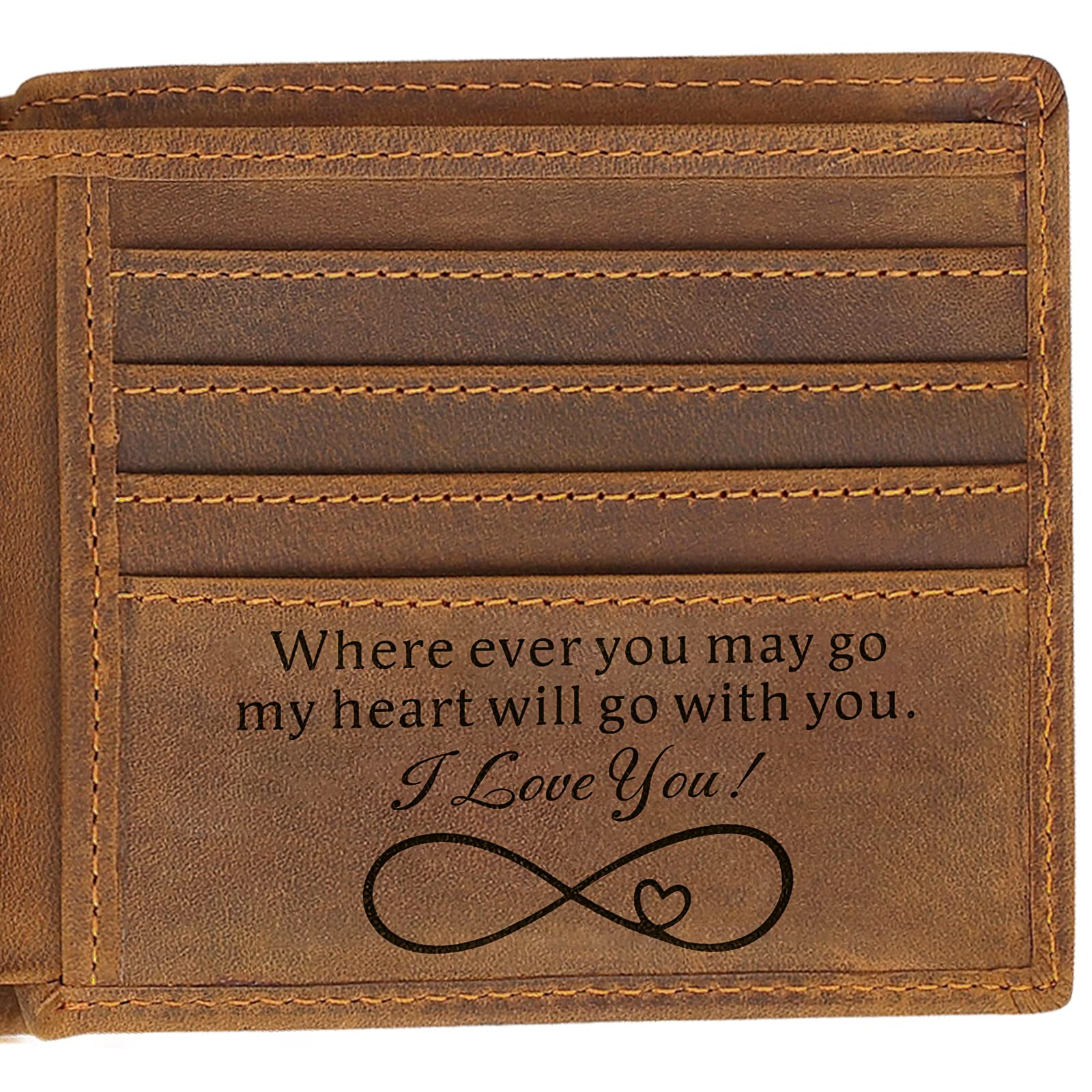 ----------------Perfect Gift For Your Husband/Boyfriend/Dad/Son---------------- Personalized engraved leather wallet features the thoughtful words. It makes the most special gift for him who can take it everywhere. VINTAGE APPEARANCE Our leather wallet is created from high-quality leather "Crazy Horse", which has the effect of vintage and will not lose its appearance as time goes by, even become more beautiful. The vintage and fashionable wallet will not go out of date with the time passed. SIMPLE BUT HIGH CAPACITY Our wallets are made by many years of experienced craftsmen, which improve the quality of every item, great stitching, and quality leather made the wallet more durable and sturdy. The wallet is in simple design but packed with everything he needs to carry. The lighter experience is made for every customer! PERFECT GIFTS FOR HIM With the most thoughtful words engraved in the wallet, he can see your love message when opening the wallet every time. The wallet is handmade, every wallet is unique and special. It can be the best gift for your loved one.