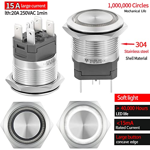 - ✅【20 Amp; Latching】Push Button Switch Current Rating:20 Amp 250V AC,Operating Current: 15 Amp; LED lamp voltage: 24V DC/AC. Hole size required: 7/8 inch / 22mm, Momentary Push Button Switch: Push and Hold-ON, Release-OFF.