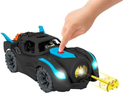 - Press the button or roll the Batmobile along to see the vehicle light up with cool sounds and flame spinning action
