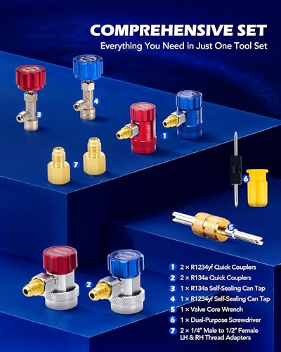 - Wide Application: This air conditioning line repair tool works with R1234yf, R404a, and R134a refrigerants; ideal for HVAC maintenance, this R1234yf AC recharge kit allows you to measure pressure, evacuate and refill coolant