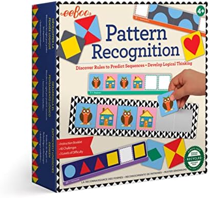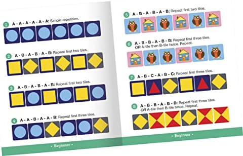 Pattern Recognition set helps children discover rules to predict sequence and further develop logical thinking, and early math and reading skills with pattern cards. A great brain muscle exercise. The challenge begins when a child pulls a card and begins to duplicate and fill in the missing pieces of the pattern using the tray and tiles to complete the pattern. Set includes 60 illustrated tiles, one tray for tile placement, 40 cards that are printed three levels of difficulty and an instruction booklet.
