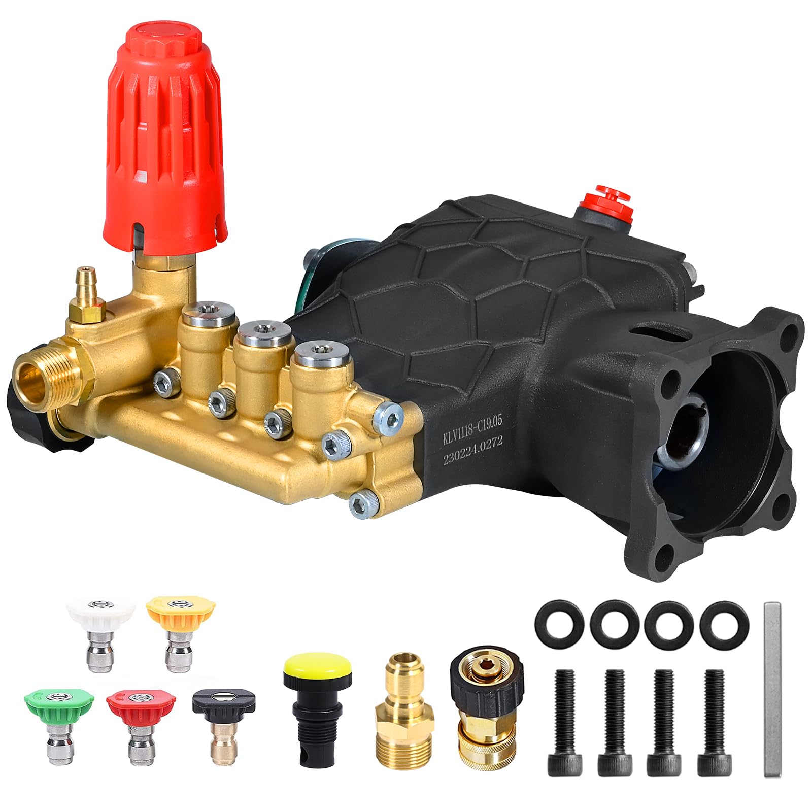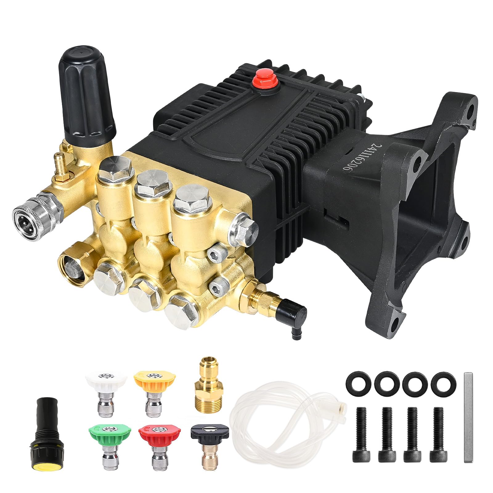 - [EASY INSTALLATION]The packet includes a chemical hose with filter, mounting bolts, shaft key, and instruction booklet to get your pressure washer back to life within 10 minutes. This replacement pump features a threaded M22 connection pressure washer hose outlet and a 3/4'' NH garden hose inlet. The standard bolt pattern fits most 3/4'' horizontal shaft gas-powered pressure washers. (*Fit 3/4'' horizontal shaft engines ONLY)