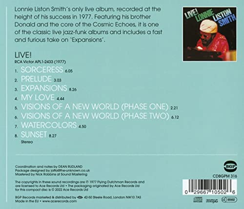 A reissue of Lonnie Liston Smith's only live album, recorded in 1977 at Smucker's Cabaret in Brooklyn and produced by Bob Thiele. It features Lonnie alongside his brother Donald in the wake of the success of 'Expansions', with a line-up completed by Dave Hubbard, Al Anderson, Ronald Dean Miller, Hollywood Barker and Michael Carvin. The album shows an intense sense of musicianship which mixes up a few tracks from previous records, including a cooking version of 'Expansions' and a beautiful take on both Phases of 'Visions Of A New World', as well as three numbers exclusive to this recording. Released with the full cooperation of both Lonnie and Flying Dutchman, this is the album's first reissue in over a decade and the booklet includes an in-depth interview with Lonnie.