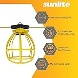 COMMERCIAL GRADE - Create a safer, well illuminated area with Sunlite Commercial-Grade Cage Light Strings. This temporary lighting solution is designed for indoor or outdoor use. Use on job sites, in attics, basements, storage areas, stairwells, parking lots, outdoor markets, marinas, or anywhere extra light is needed. 50-FOOT, 5-SOCKETS - Each 50-foot string features 5 medium base sockets (E26) spaced 10 feet apart. 5 feet of lead and 5 feet of cord at the end of the string with covered plug allows you to connect multiple sets together for a larger coverage area. Each socket has an eyelet on top that can be used to hang in place. OVERSIZED CAGES - Cages are designed to accommodate standard A19 to larger A23 size bulbs of up to 150 Watts (bulbs not included). Use with LED bulbs for a more energy efficient lighting solution. INDOOR OR OUTDOOR USE - Weather proof PVC coating on the sockets and 16 gauge wire is designed to withstand the elements while plastic cages help protect the bulbs from damage. Bright yellow color for high visibility. ETL LISTED - This light string is ETL Listed for wet location use and has been tested to meet their rigorous design and safety standards.