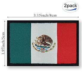 SPECIFICATION: Set of 2 Mexico patch with hook-fastener backing per pack. The right size (3.15 x 1.97 inch/8 x 5cm) allows it to be sewn into any garment. EXQUISITE WORKMANSHIP: Laser cutting makes loop side the same size as tactical patch. Tactical patches are made from premium industrial strength polyester and the patches made by high-precision embroidery machines are bright in color and clear in texture. APPLICATIONS: Perfect decorations for military uniform, tactical bag, jacket, team, backpacks, hats, etc. It's a great way to decorate your garment and add a simple patriotic touch to your belongings. VIVID COLOR and DURABILITY: Imported. Made of 100% polyester. UV fade resistance emblem makes the color lasting as new as intact. Mexican patch features hook and loop Fasteners backings that can be sewn to any hats, backpacks and uniform and easy to remove, wash or replace other types.