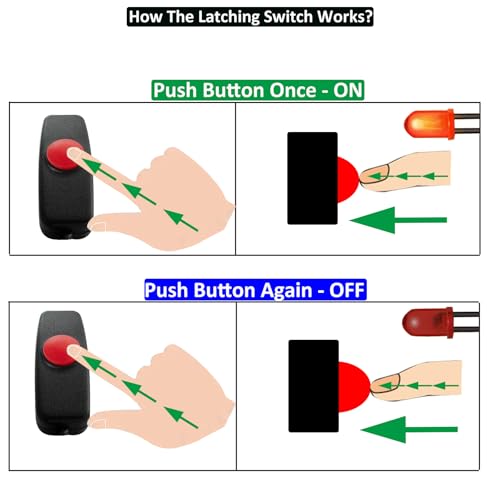 - [Latching Switch]: Push button once, it’s on, push button again, it’s off.