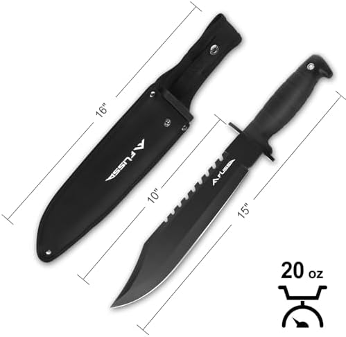 FLISSA Survival Hunting Knife with Sheath, 15-inch Full Tang Fixed Blade Tactical Bowie Knife with Sharpener & Fire Starter for Camping, Outdoor, Bushcraft