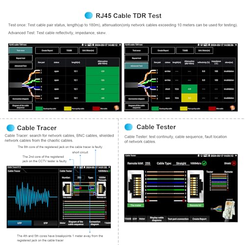 - [ Cable Tracer Cable Test ] Digital Cable tracer can search BNC cable, network cable and telephone cable from the mess of cables. Support test UTP cable connection status and display on the screen. RJ45 cable TDR testing: test cable pair status, length, attenuation, reflectivity, impedance, skew