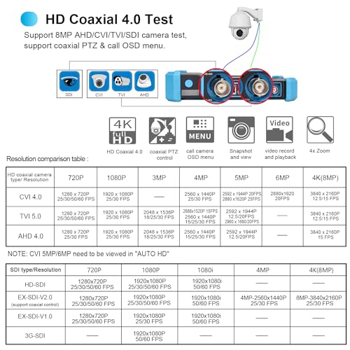 - [ TVI CVI AHD SDI Camera Tester ] WANLUTECH CCTV monitor tester supports 8MP TVI / CVI / AHD / SDI camera testing and UTC control, and supports calling OSD menu. Auto HD -recognize the resolution and image display of Analog and HD cameras. Support coaxial PTZ and call OSD menu. Support CVBS and 8MP TVI/CVI/AHD cameras. Select relative function on the right side toolbar to operate, functions including ''Photos'', ''Snapshot'', ''Record'', ''Playback'', ''PTZ'', ''Set''. Multiple preview APP supports synchronized preview of multiple cameras, playback of the camera 2 to 3 frames per second, up to 32 simultaneous preview