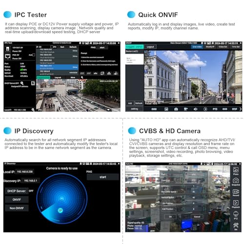 - [ Upgraded IP Analog Camera Tester ] 5.4'' IPS touch screen,IP Discovery/Quick ONVF/IPC test /RTSP play /Client APK. Auto view the video, create testing report.Support batch activate Hik and DH cameras and modify IP address, modify password etc. Self-defined modify channel name. Supports CVBS analog camera test.1 channel BNC input, NTSC/PAL (Auto adapt); PTZ control, RS485 control, Baud 600-115200bps, compatible with more than 30 protocols
