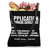 Funny application software developer job definition a person who solves problems that you didn't even know existed in a way that you don't understand. They ensure that a program continues to function normally through software maintenance and testing. Perfect Design for application software developers, computer students, and programming jobs. A funny conversation outfit when joining an assembly with colleagues or when participating in a software development workshops and conventions. 16” x 16” bag with two 14” long and 1” wide black cotton webbing strap handles. Made of a lightweight, spun polyester canvas-like fabric. All seams and stress points are double-stitched for durability, and the reinforced bottom flattens to fit more items and hold larger objects. Spot clean/dry clean only.