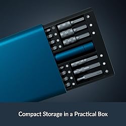 Precision Screwdriver Toolkit: Phillips (PH0000, PH000, PH00, PH0, PH1, PH2), Slotted (SL1, SL1.5, SL2, SL2.5, SL3, SL4), Hexagon (H0.7, H0.9, H1.3, H1.5, H2, H2.5, H3, H3.5, H4), Torx (T2, T3, T4, T5), Torx Security (T6H, T7H, T8H, T9H, T10H, T15H, T20H), Pentalobe (P2, P5, P6), Y-Type (Y0.6, Y1.5, Y2.5, Y3.0), Pozidriv (PZ00, PZ0, PZ1), U-Type (2.3, 2.6, 6), Triangle (2, 2.3, 3), Square (0, 1, 2), JIS (J000, J00, J0, J1), mini-hexagon inserts (2.5, 3, 4, 5), MID, magnetic bit and SIM pin Includes plastic sorting box with aluminum cover that provides space for the screwdriver and bits The magnetic bit holder ensures safe handling, holds bits reliably and makes it easier to guide and fix screws