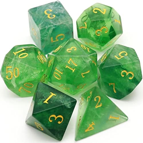 - 7PCS Handmade Real Green Fluorite Gemstone Dice with premium dice case. Each dice set includes one of D4, D6, D8, D10, D%, D12 and D20.
