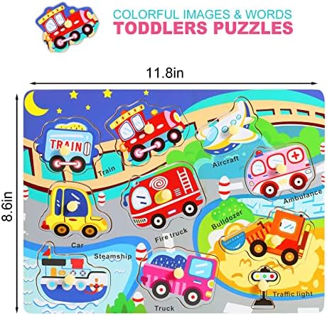 Wooden Peg Puzzles for Toddlers 2 3 4 Years Old, Kids Educational Preeschool Peg Puzzles Toy, 3 Pcs Toddler Puzzles Set - Traffic, Animals and Nunbers, Great Gift for Girls and Boys