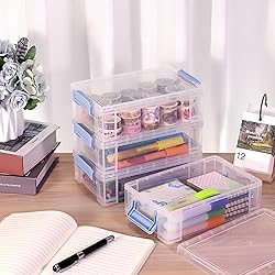 Extra Large Pencil Boxes: Exterior Dimensions: 8.3"L x 5.5"W x 2.7"H,Interior Dimensions: 7.7"L x 4.7"W x 2.4"H. This hard pencil box is deeper than the standard pencil box in markert. Comes with 4 pack stackable pencil boxes, holds lots of items, such as Holds 150+ pencils, 80+ pens, 50+ markers, or 250 crayons. Age of Application: 3 yrs+. Widely Use: Pack of 4 meets your daily needs, which are sufficient for a variety of uses such as desks, offices, art supplies, and more; These plastic storage containers are perfect for organizing pens, marker, pencils, crayon, art, craft and other school office supplies miscellaneous items. Stackable & Portable Design: The clear pencil box features a stable stackable design, which maximizes space utilization and keeps your desktop neat and organized. The slim, space-efficient shape fits easily into most desks, drawers as well as backpacks and briefcases, lightweight and portable. Secure Snap-tight Lid and Handles: With bilateral secure latch handles that securely fastens the lid. The well-made latches makes it easy to open and close. The tight-fitting lid keeps the art supplies for a secure hold when it falls. Clear & Sturdy Material: Constructed with quality plastic and exquisite workmanship, the pencil case organizer is super sturdy, strong and sturdy to store and protect your items for a long time. It will be around for many years to come! The transperant material allows for easy item retrieval.