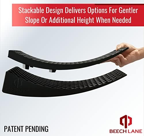 - GIVES YOU MORE TIME TO FIND LEVEL BY REDUCING THE TYPICAL STEEP LEVELER RAMP CURVE - Beech Lane's patent pending stackable leveler design reduces the steep curve of the typical camper leveler by using a removable top 1" section of the leveler: leaving you with a 3" high curved leveling ramp for your typical campsites. When you arrive at that outlier campsite that requires more than 3" of lift, just stack the top 1" leveler section on top and you can get up to 4" of lift with a steeper curve.