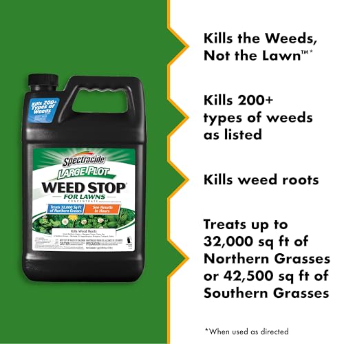 Spectracide® Large Plot Weed Stop® For Lawns Concentrate kills more than 200 types of weeds as listed – and it won’t harm your lawn when used as directed. This concentrated formula treats up to 32,000 square feet of Northern Grasses or 42,500 square feet of Southern Grasses with overnight results, and it kills weed roots. It kills all major broadleaf weeds, including dandelion, chickweed and clover (see product label for complete list). This product is rainproof in hours, so it won’t wash off. Mix with water and apply with a pressure sprayer or hose-end sprayer at the rates directed on the label. For best results, mow before treating weeds with Spectracide® Large Plot Weed Stop® For Lawns Concentrate. Spray in spring when weeds are small and growing, or in fall when many problem weeds germinate – treating in fall will eliminate many of next year’s weeds. If certain tough weeds are not dead within 3 weeks, repeat spot treatment. Read the entire label before using.