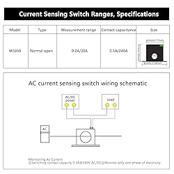 - Specification: Model: M3050 Power supply: Not required Rated load: ≤ 0.5A@240V AC/DC Input current: 0.2-30A AC Switch on minimum: 0.5±0.2A Maximum overload: 100% Leakage current: ≤0.1A Accuracy: 1% Hysteresis: ≤1% Response time: ≤200ms Repeatability: 100% Working temperature: -20~60℃ Waterproof: IP30 Dimensions: 65 x 25 x 47mm / 2.56 x 0.98 x 1.85in Hole diameter: 10mm / 0.4in Package weight: Approx. 56g/2.0oz Package list: 1 x Current Sensing Switch