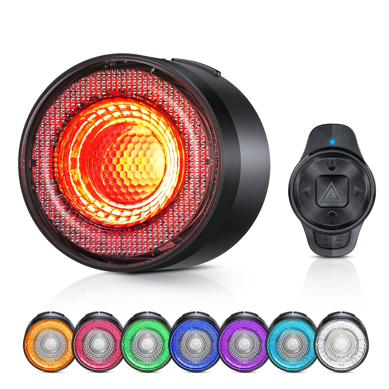 - SMART TAIL LIGHT WITH TURN SIGNALS AND ALARM: Multi-functional tail light is featured with brake light /turn signals/warning light/electric bell/anti-theft alarm.The practical bike accessory! 31 COB LEDs bring the brightness of the bicycle taillight to 160 lumens, 200-degree wide-angle design makes you more visible during the night ride. With 6 lighting modes, Slow Flashing/Breathing/Fast Blinking/Steady Light/Emergency Light/OFF.