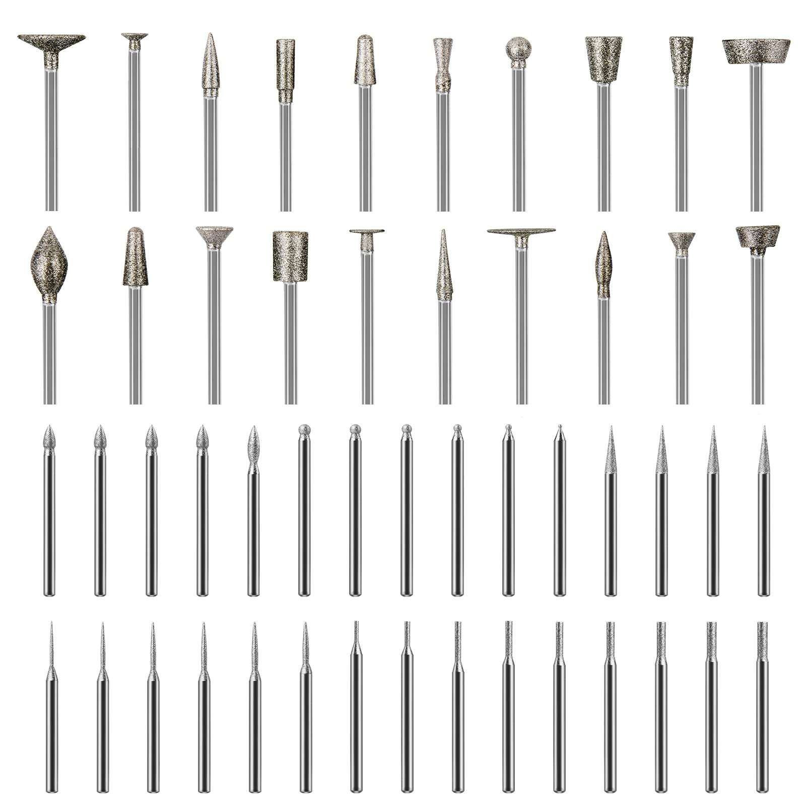 - 【Great Gift for DIY Enthusiasts】: 10 Different Shapes diamond grinding burr bits, includes sphere, cone, cylinder, round head cylinder, bullet, etc, Rich in quantity and various shapes meet your many grinding and carving needs