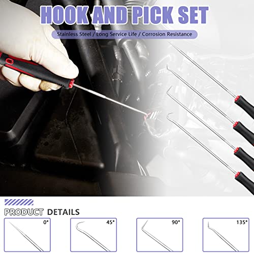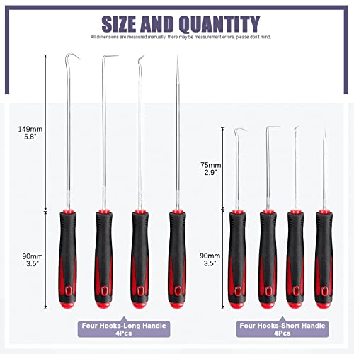 - 💯 8Pcs Long and Short Pick and Hook Set ------- This O rings kit have hook and pick set (8 pieces), it can let you to remove o rings and various seals and bushings easily. The long shaft allows you to access areas that conventionally sized hook and picks just can't reach. These long hooks and picks are perfect for removing O-rings, hoses, gaskets, moldings, clips, seals, cotter pins and more.